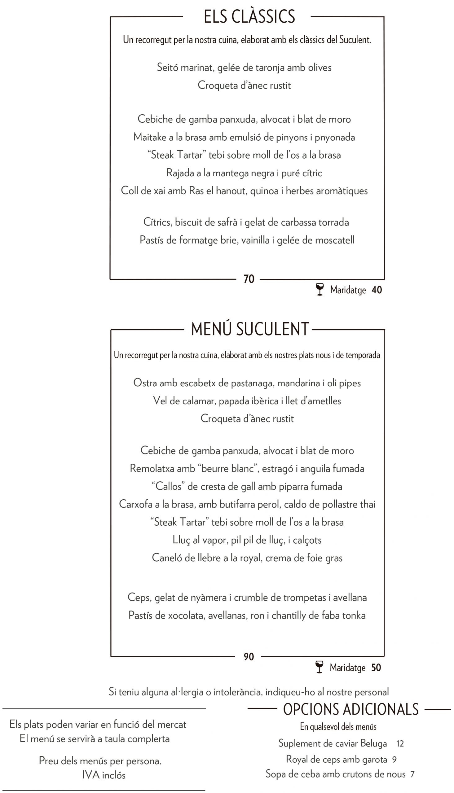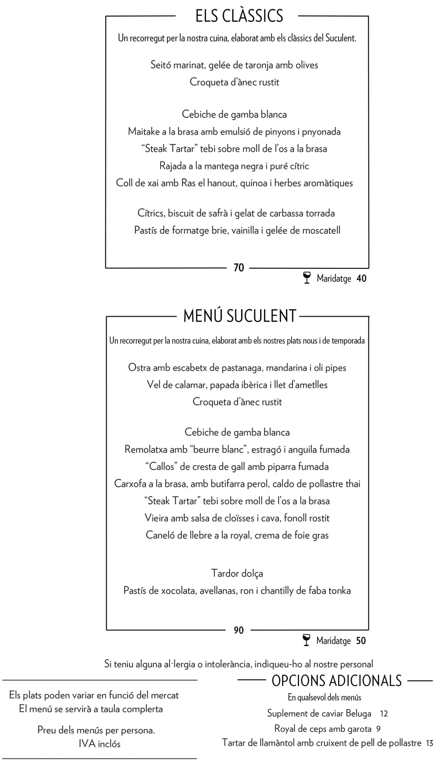 MENÚS Els plats poden variar en funció del mercato les necessitats del nostre client.Preu dels menús per persona.IVA inclòsPer a taules de més de 6 persones, cal escollir un dels menús degustació.